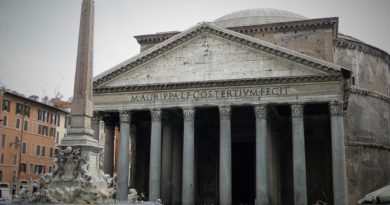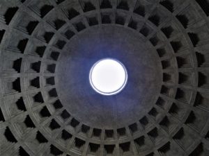 PANTHEON: Siga para outro marco da cidade: o Pantheon, Templo de todos os deuses. A estrutura atual foi construída no ano 118. Neste prédio é preciso ficar atento a todos os detalhes. Preste atenção inclusive no teto: há um intrigante óculo (abertura circular no topo do domo), que permite a entrada de luz no interior do templo.