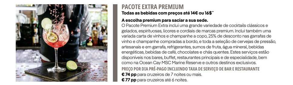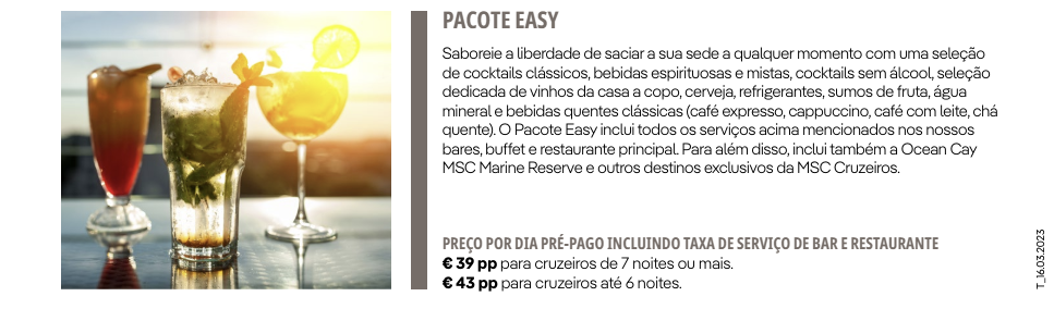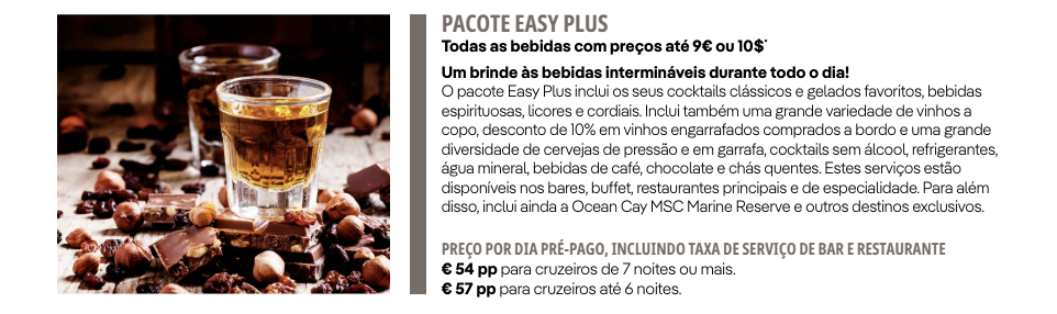 Para exemplificar, trazemos os valores dos pacotes de bebidas de um navio da MSC: